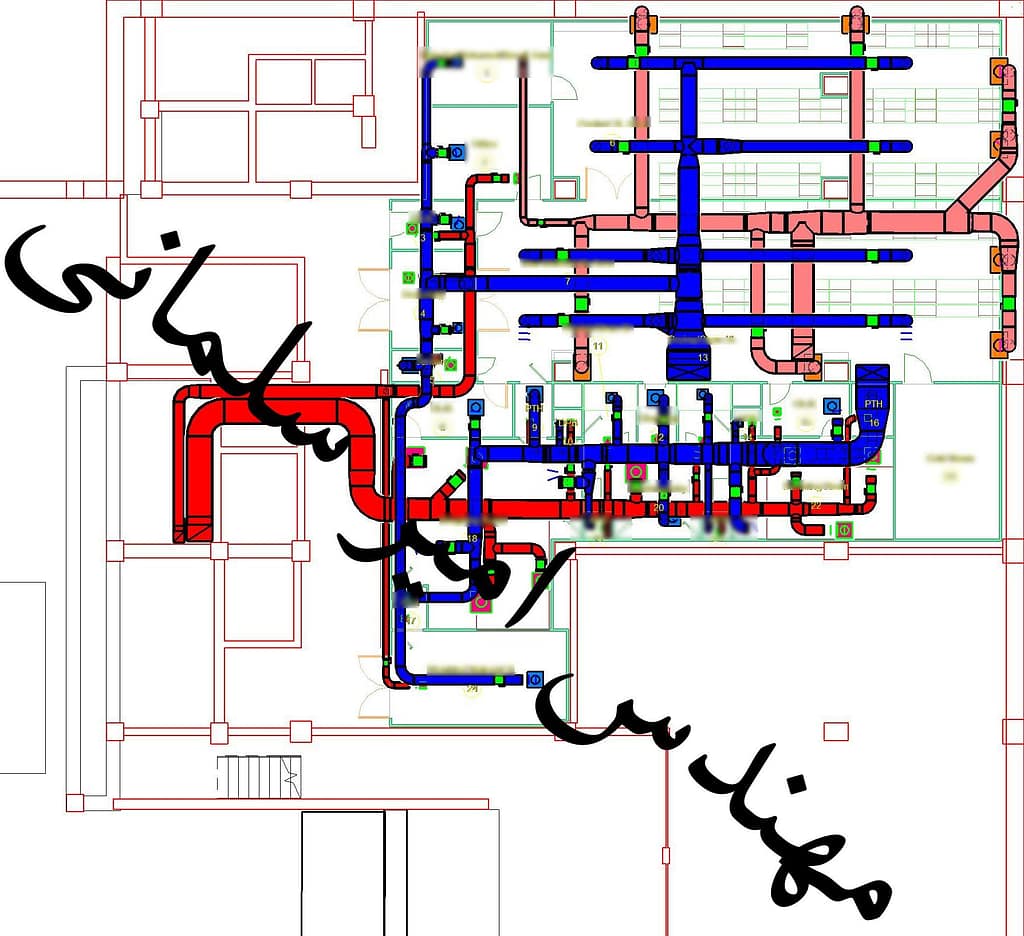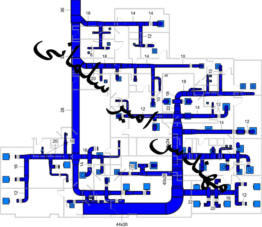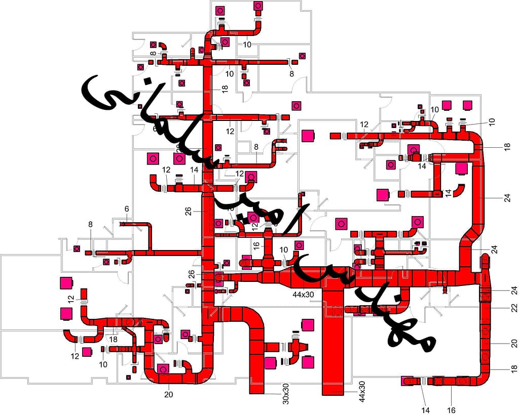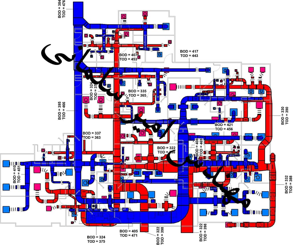 اصل کلیدی در این زمینه، طراحی مسیر کانالها بهگونهای است که از ایجاد پیچ و خمهای غیرضروری، زانوییهای تند، و تغییر قطر ناگهانی لولهها جلوگیری شود. استفاده از زانویی با شعاع بزرگ، انتخاب قطر مناسب کانال بر اساس دبی طراحی، و حفظ نسبت یکنواخت بین طول مسیر و تعداد اتصالات میتواند افت فشار را به حداقل برساند.